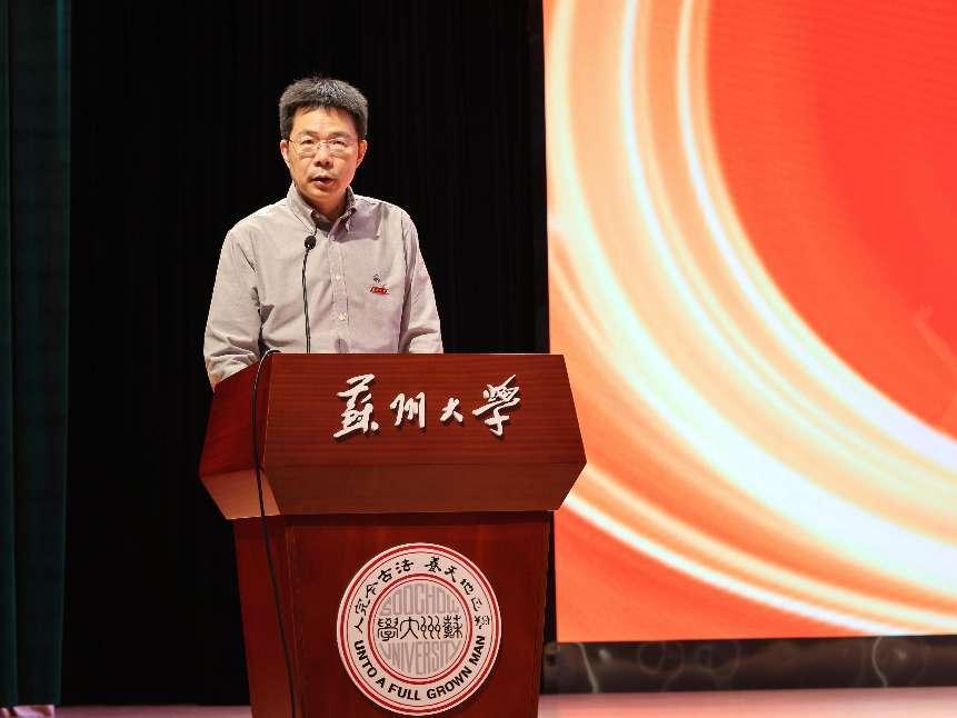 教师代表王加俊教授结合当今信息技术领域遭遇发展瓶颈的问题,分别从本科生和研究生两个角度寄语新同学,鼓舞大家坚守理想信念、提升综合素质、培养探索批判精神、积极探索学科交叉,勇做时代的弄潮儿,助力电子信息产业发展。