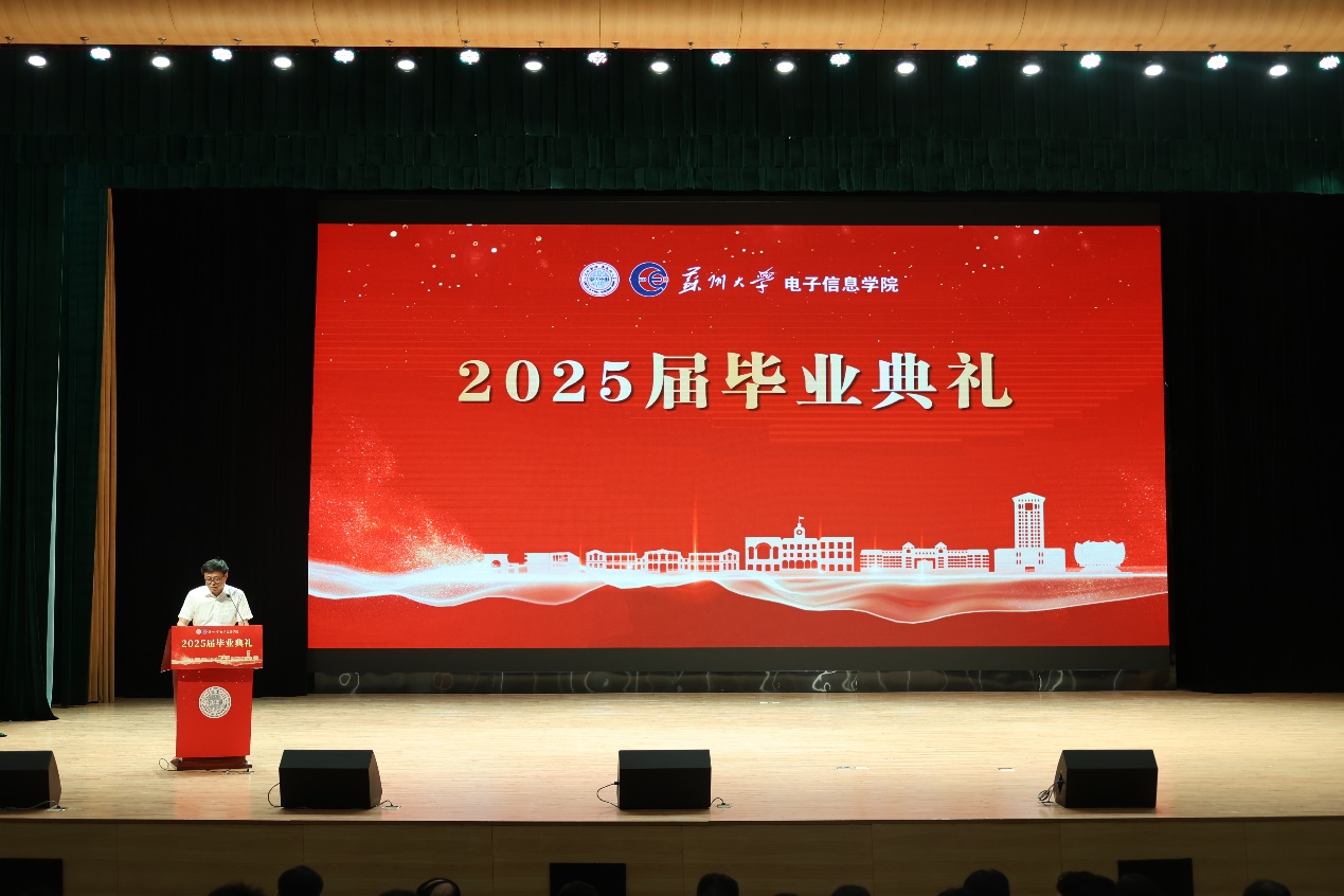 院长沈纲祥教授发表致辞,他代表海角app 向全体毕业生表示热烈祝贺,向辛勤付出的老师及支持毕业生的家长亲友致以诚挚谢意。他指出,海角app 始终秉持“品格高尚 专业精深”的院训,立足地方,构建起一流学科体系,同学们在海角app 不断成长,本科同学从懵懂少年成长为具备系统工程能力的科技人才,研究生同学在学术探索与工程实践中不断突破自我、攀登高峰。最后,沈院长殷切嘱托毕业生们要心怀大我、崇德尚学、终身学习,期望他们在电子信息领域书写精彩人生。