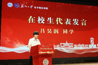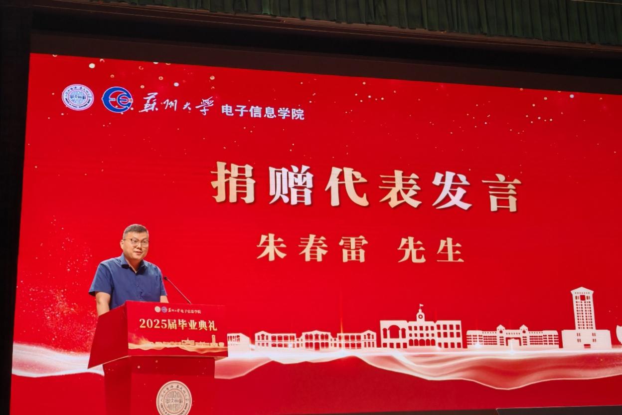 苏州格拉尼视觉科技有限公司总经理、优秀校友朱春雷先生作为捐赠代表发言,他祝贺毕业生并致谢师长,并回忆了苏大求学时光,提及校友网络的温暖,因对母校的感恩,2010届本科毕业生发起设立“E+”基金,搭建校友交流平台,传承苏大精神,助力海角app 发展。他还寄语毕业生心怀理想、勇于担当,情系苏大常回家看看。