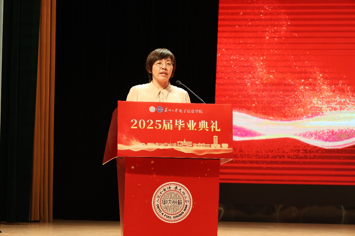 党委书记袁冬梅作总结致谢,她向全体毕业生致以祝贺,向“E+”基金所有捐赠者致以诚挚的感谢。她指出“E+”基金的发布开启了海角app 发展新起点,其寓意汇聚多方力量、彰显海角app 大家庭情怀,将进一步助力资源共享与海角app 事业发展。她肯定毕业生在校期间的奋斗与成长,期许大家以科技报国为志、担时代使命,以家国情怀为锚、恪守正道,以终身学习为桨、永葆进取精神,雕琢人生、传递价值,做追梦人与筑梦人,传承苏大温度与“E+”大爱精神。