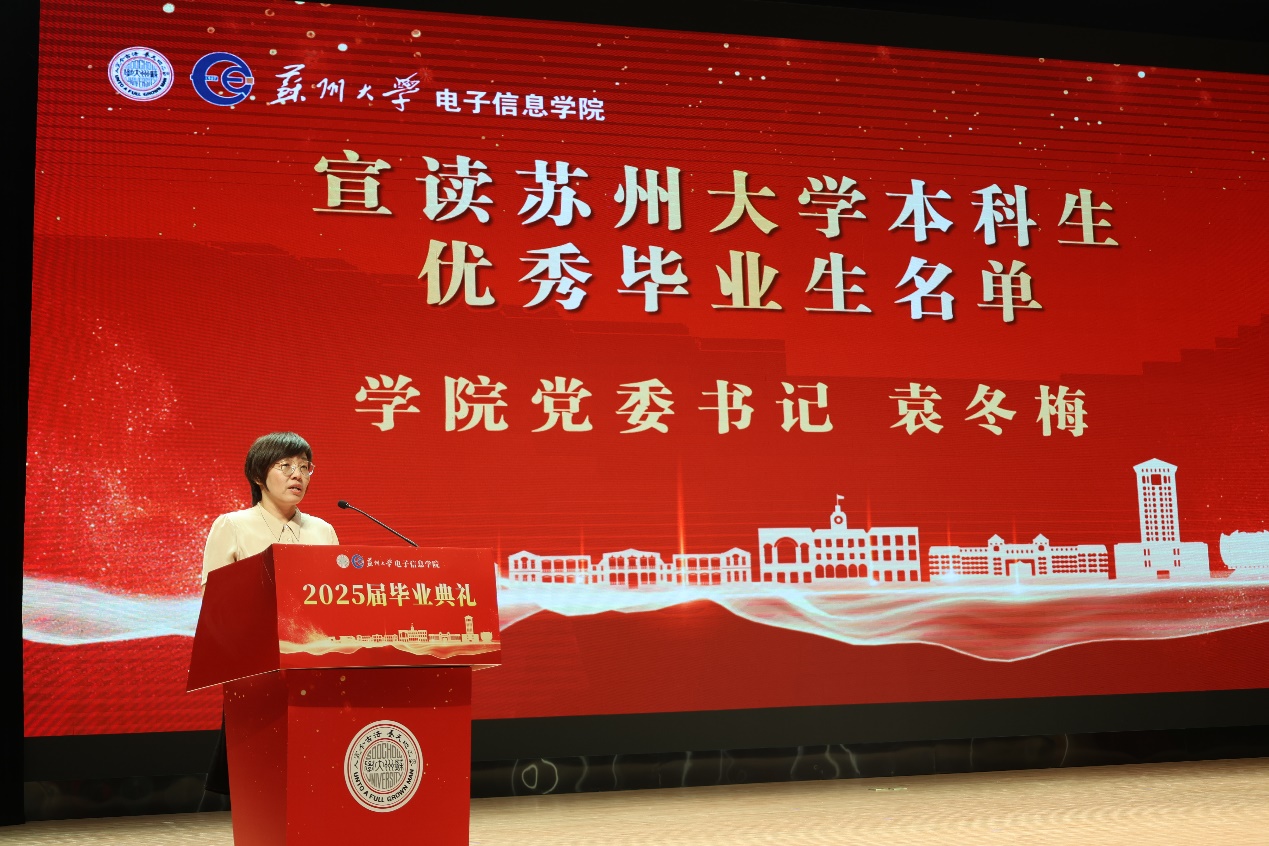 接着,党委书记袁冬梅宣读了海角app 研究生优秀毕业生、本科生优秀毕业生名单及国内外升学主要去向高校。副院长倪锦根宣读了海角app “芯青年之星”和“E起超越”学霸宿舍获奖名单。