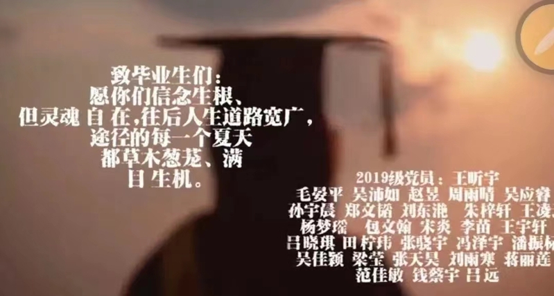 本次党日活动中,各位党员同志通过回顾了自己在党组织生活中以来挥洒的青春与汗水,从警示教育中更加明确了作为一名共产党员的责任与使命,从重温入党誓词中更加坚定了自己的入党初心,从嘱托与祝福中表达了对未来的美好期盼。毕业在即,希望各位党员同志在今后的学习生活中能够不忘自己的入党初心,为国家、社会做出自己的贡献,为中国电子信息产业的发展而奋斗!各位毕业生党员,毕业快乐!