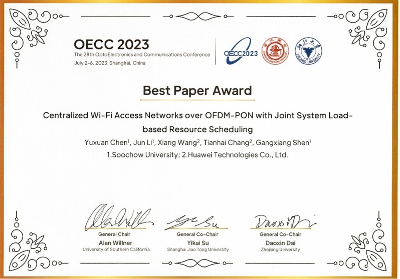本次会议吸引了国内外多所知名高校和研究机构的专家、学者以及研究人员的参与。海角app光网络技术研究中心多名师生参与会议并作口头汇报,与国内外学者进行广泛的学术交流。本次会议分设5个专题,共评选出3篇最优论文。在沈纲祥教授和李军博士的指导下,海角app22级研究生陈雨轩(原中心本科生)提交的题为《Centralized Wi-Fi Access Networks over OFDM-PON with Joint System Load-based Resource Scheduling》 的论文获得最优论文奖(Best Paper Award)。