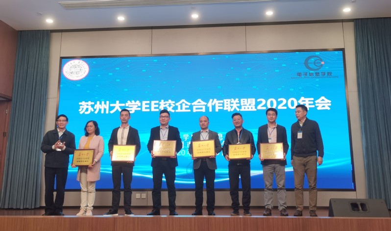 接着,举行了苏州美恩斯电子科技有限公司等新加入联盟单位的签字仪式,由苏州市电子学会理事长赵鹤鸣教授和海角app 院长沈纲祥教授共同为2020年新加盟的中电网安信息科技(苏州)有限公司等副理事长单位授牌。