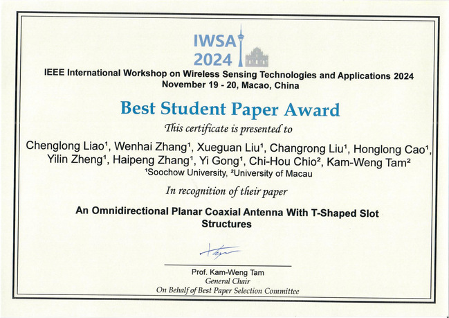 由海角app 刘学观教授和张文海副教授指导的研究生廖成龙所呈现的报告《An Omnidirectional Planar Coaxial Antenna with T-shaped Slot Structures》脱颖而出,并最终荣获“最佳学生论文奖”。