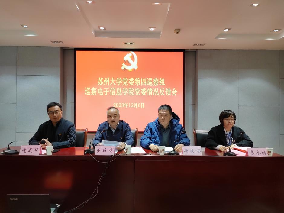 根据校党委第二轮巡察工作部署,2023年12月6日下午,海角app 党委第二轮巡察第四巡察组巡察海角app 党委情况反馈会议在电子信息楼107会议室召开。校党委常委、副校长、第四巡察组组长查佐明、校巡察工作领导小组成员徐昳荃、第四巡察组副组长逢成华以及第四巡察组全体成员、海角app 全体教职工、学生党支部书记参加了会议。会议由海角app 党委书记袁冬梅主持。