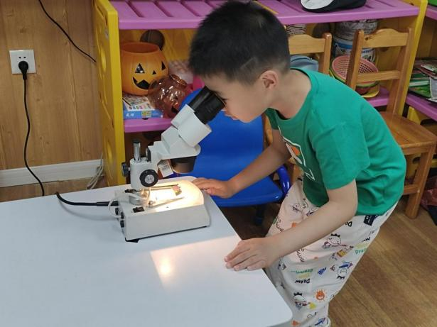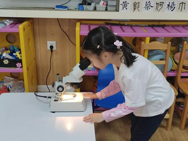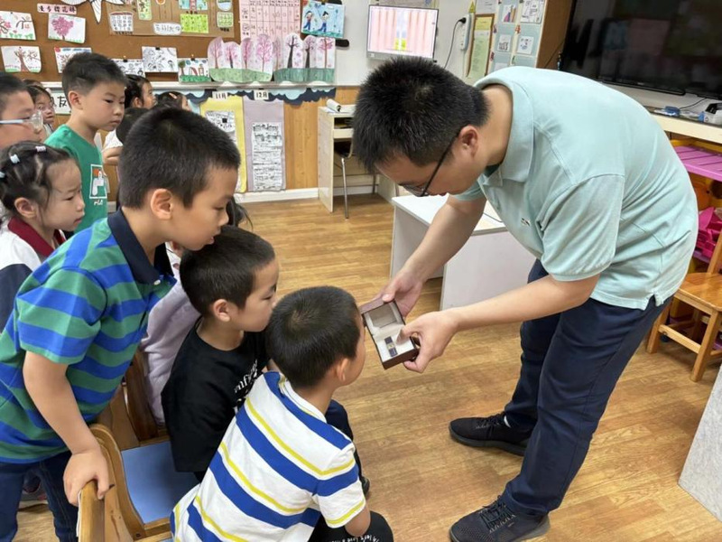 好奇心驱使着小朋友们都想一探究竟,这比指甲盖还要小的一块小晶片,肉眼看不出特别,到底蕴藏着什么奥秘。在白老师的细心指导下,小朋友们排起队,挨个通过显微镜进入科学的微观世界。“好像迷宫一样!”“密密麻麻的!”大家看得兴致勃勃。为了满足孩子们的求知欲,白老师通过问答、短视频等方式,围绕金属铜线、原材料、形成过程等内容,积极互动,让孩子们对芯片有了初步认识,感受到科技就在身边,创新源于生活。