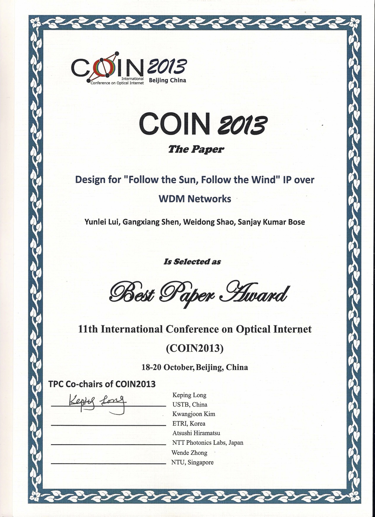 光网络技术研究中心研究生在COIN国际会议获最优论文奖