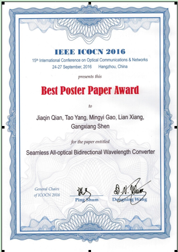 光网络技术研究中心2014级硕士生钱佳沁同学(导师:高明义)的论文荣获“ Best Poster Paper Award ”。