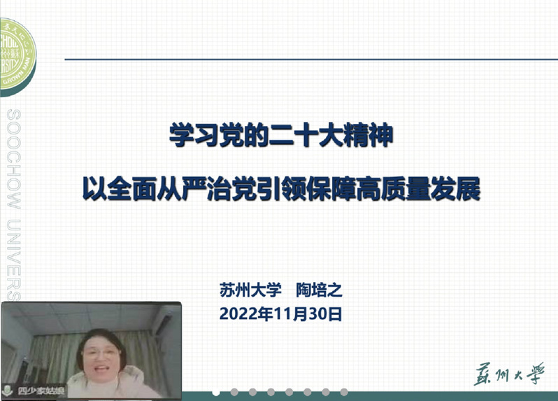 陶培之副书记从以自我革命精神推进全面从严治党、新时代全面从严治党要害在治、牢固树立大抓基层的鲜明导向、以全面从严治党引领保障高质量发展等四个方面,结合党的二十大报告,详细阐述了健全全面从严治党体系这一新时代党的建设总要求,既通过典型案例对高校党风廉政建设和反腐败方面开展警示教育,又对高校全面从严治党、维护良好政治生态提出分析和指导。
