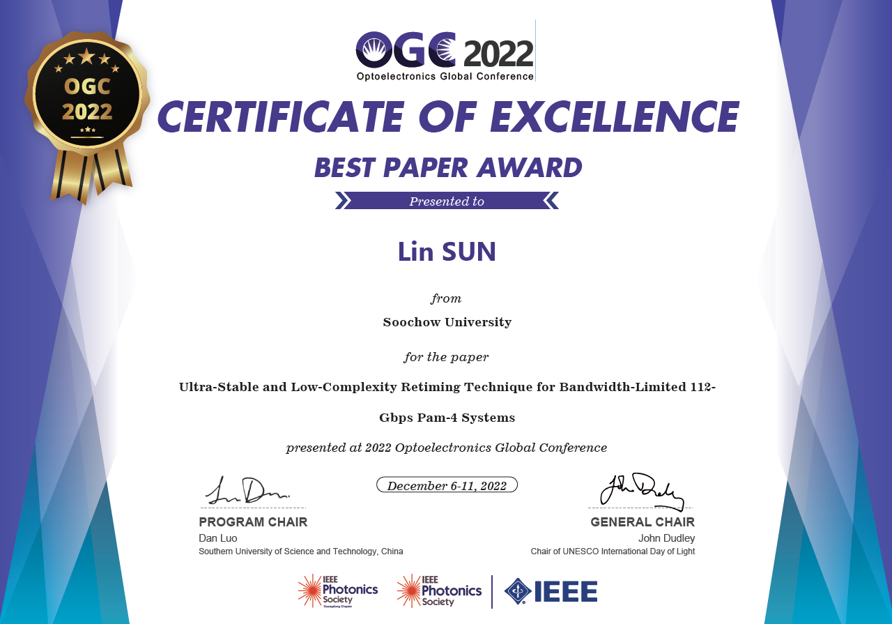 近日,光网络团队荣获2022年光电全球大会(Optoelectronics Global conference, OGC2022)最佳论文奖。OGC是IEEE Photonics Society 主办的光通讯领域顶级国际学术会议,今年在中国深圳举办。该论文面向高速光网络的快速路由需求,提出一种快速、稳定的时钟恢复技术,具有较大的产业应用及学术价值。该成果由海角app 光网络团队牵头,孙林博士第一作者及口头汇报者。