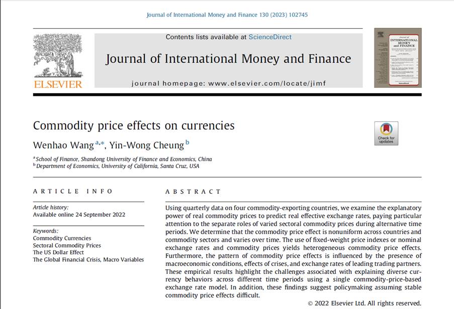 海角app 教师王文浩作为第一作者与加州大学圣克鲁兹分校教授Yin-Wong Cheung合作的论文“Commodity price effects on currencies”,在期刊Journal of International Money and Finance在线发表(2022年9月)。该期刊为SSCI二区期刊,期刊最新影响因子为2.762,属海角app A1类期刊。