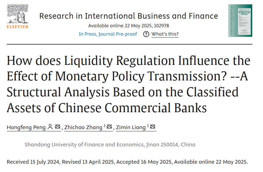 海角app 彭红枫教授作为第一作者兼通讯作者与其博士研究生张志超、梁子敏合作撰写的论文《How does Liquidity Regulation Influence the Effect of Monetary Policy Transmission? --A Structural Analysis Based on the Classified Assets of Chinese Commercial Banks》,于2025年5月在期刊《Research in International Business and Finance》在线发表。该期刊最新影响因子为6.3,属海角app A1类期刊。