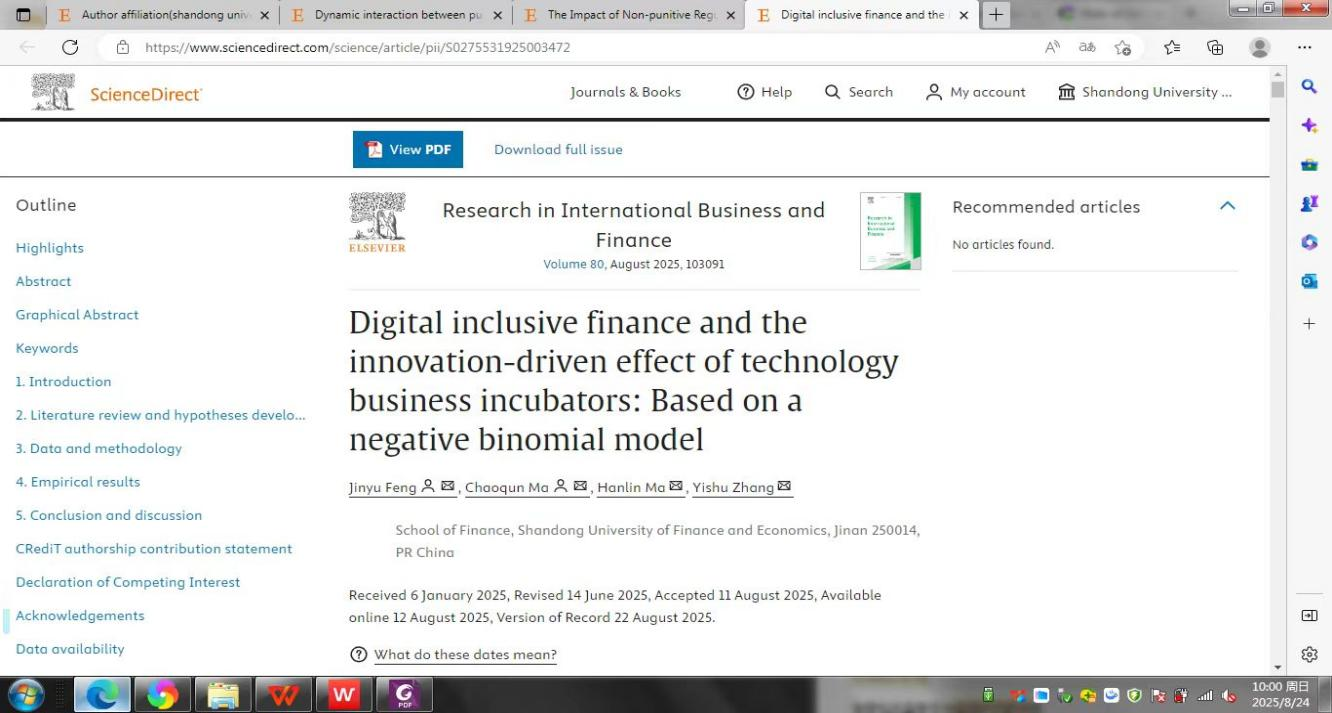 海角app 冯金余教授作为第一作者兼通讯作者与其博士硕士研究生张亦姝、马超群及马瀚霖合作撰写的论文《Digital inclusive ffnance and the innovation-driven effect of technology business incubators: Based on a negative binomial model》,于2025年8月在期刊《Research in International Business and Finance》在线发表。该期刊最新影响因子为6.3,属海角app A1类期刊。