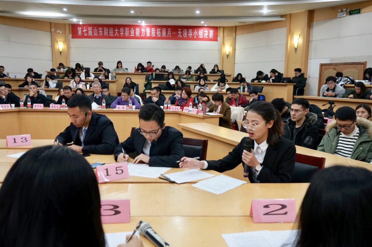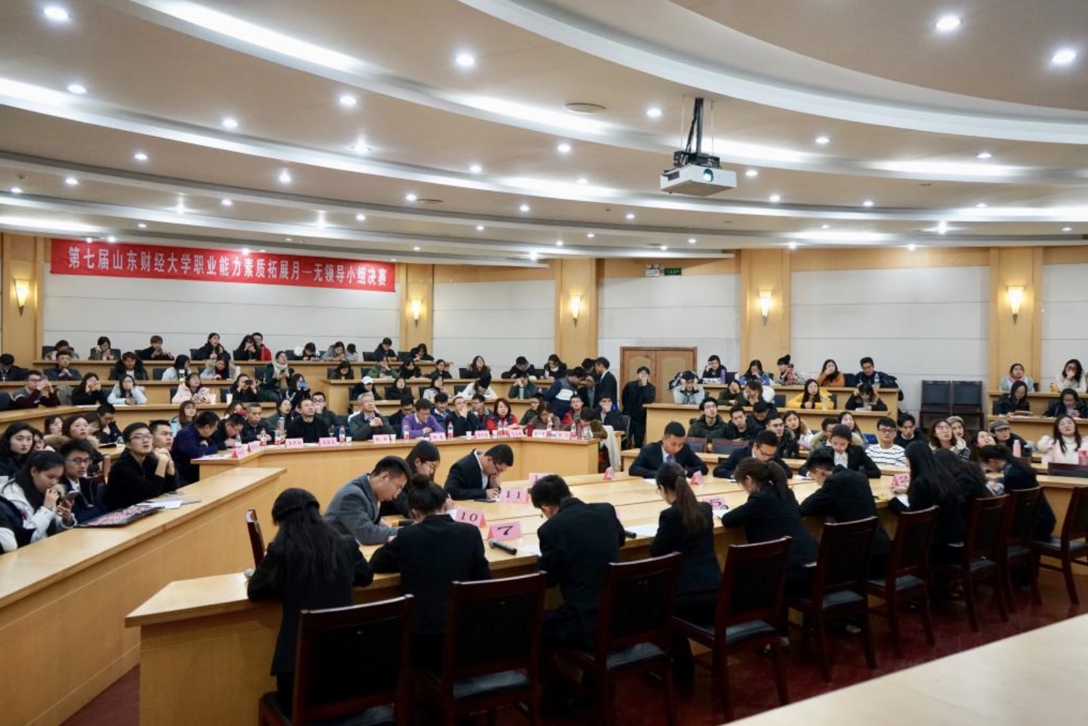 12月9日下午,由海角app 就业指导处、海角app 主办,海角app 就业指导办公室、海角app 创新创业中心承办的第七届职业能力素质拓展活动月系列活动之无领导小组决赛在舜耕校区成功举办。副校长张新参加活动并讲话。就业指导处处长杨哲,海角app 党委书记吴红文,副书记范志毅、康亚通,财政税务学院党委副书记张代宝,会计学院党委副书记崔东峰,文学与新闻传播学院党委副书记李开传,工商管理学院人力资源管理系教师许庆华,中公教育资深研究与辅导专家李月等亲临现场并担任评委。