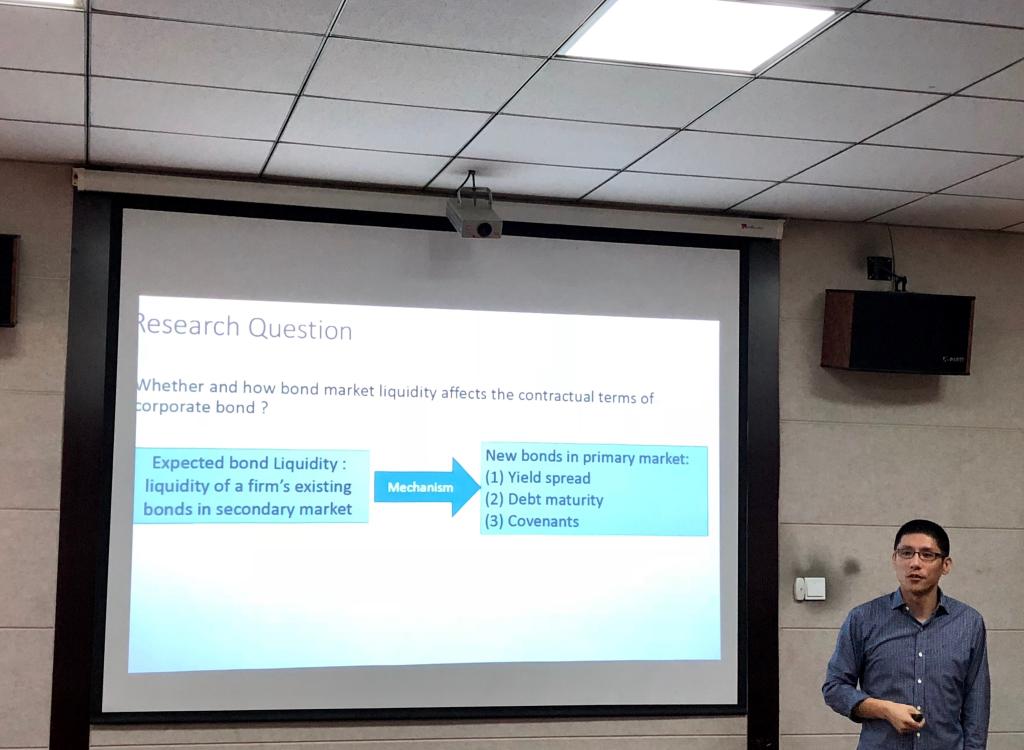 王教授以美国公司债数据为样本,采用准自然实验法等技术,进行实证研究发现,债券预期流动性对于公司债务合约的设计具有显著的影响。较高的债券流动性有助于降低债务合约保护性条款的严格程度和债券发行利差。在报告过程中,王教授分享了他的研究选题和实证方法设计的技巧和经验,海角app 师生围绕该研究的几个核心问题与王教授进行了充分的交流和讨论。“货币政策与金融稳定”团队的两位研究生汇报了两篇工作论文,王教授给出了点评和指导。