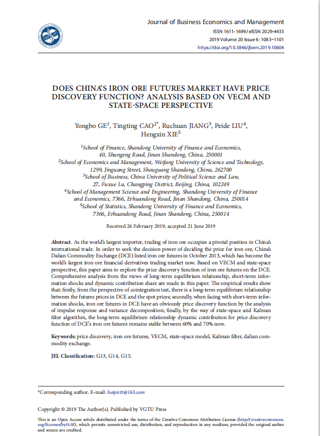 葛永波教授作为第一作者撰写的论文“Does china’s iron ore futures market have price discovery function? Analysis based on VECM and state-space perspective”在期刊《Journal of Business Economics and Management》发表(2019年第20卷第6期)。该期刊系经济学SSCI二区期刊,2018年影响因子为1.855,属海角app A1类期刊。