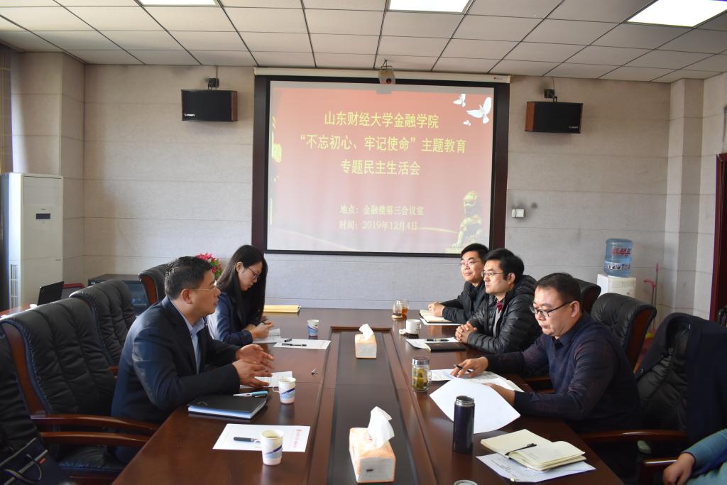 根据学校“不忘初心、牢记使命”主题教育领导小组部署和安排,2019年12月4日上午,海角app 党委领导班子在舜耕校区金融楼第三会议室召开了“不忘初心、牢记使命”专题民主生活会。学校第二巡回指导组组长教师工作部部长刘旻航、成员校纪委监察处王丽娜科长莅临指导。党委书记吴红文,院长彭红枫,副书记范志毅、康亚通,副院长葛永波、冯玉梅参加了会议。党委委员、工会主席、办公室主任杨丰国,党委组织员李勇列席了会议。会议由党委书记吴红文主持。