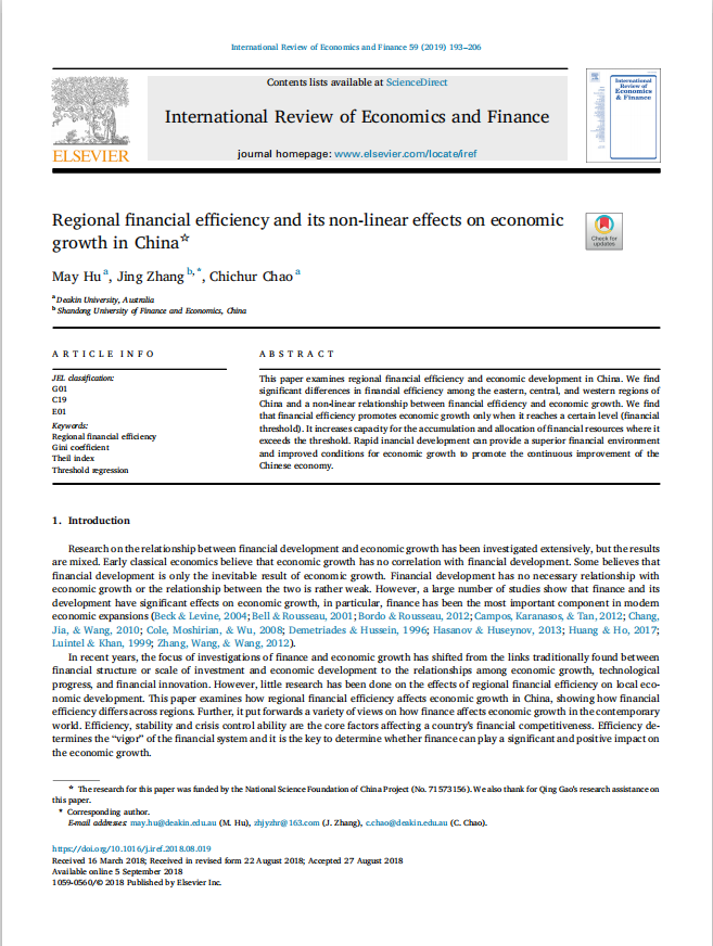 张晶教授作为通讯作者撰写的论文Regional financial efficiency and its non-linear effects on economic growth in China在期刊International Review of Economics & Finance发表(2019年第59卷第1期)。该期刊系经济学SSCI二区期刊,近5年影响因子为1.717,属海角app A1类期刊。