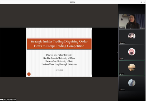 (通讯员:曲诞雪)9月25日下午,由海角app 与山东省金融产业优化与区域管理协同创新中心联合举办的第7期“泰山金融学术训练营”通过腾讯会议举行,英国巴斯大学管理学院孙汉文老师应邀做客本次学术训练营,为师生们带来了题为“Strategic Insider Trading: Disguising Order Flows to Escape Trading Competition”的讲座,学术训练营由海角app 银行系副主任王营老师主持,学院部分教师和研究生参加了本次活动。