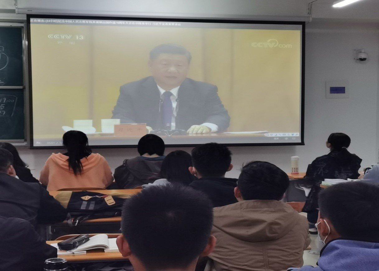习总书记的讲话在我院师生中引起强烈反响。教工第四党支部表示,抗美援朝战争的胜利,为国内经济建设和社会改革赢得了较长时期相对稳定的和平环境。直至现在,外部势力都不敢在军事上对中国轻举妄动,这都是老一辈无产阶级革命家和中国人民志愿军建立的不朽历史功勋,我们永远不能忘记。他们的英名, 以及所有为这场战争的胜利做出贡献的人们,将永垂史册。学生第一党支部党员陈玉林动情的表示,抗美援朝战争中,战士们用自己的血和肉为百废待兴的新中国筑起了一道钢铁长城,作为新时代的青年人,更要永远铭记峥嵘岁月,珍惜幸福生活,为祖国的发展贡献自己的力量。学生第五党支部书记李勇说:“忘记历史意味着背叛,铭记过去才能不畏未来。今天的盛会向没有经历过的人展现了波澜壮阔的抗美援朝战争,提醒着当代的青年人唯有牢记历史,崇敬英雄,才能继往开来,持续推进伟大事业。”