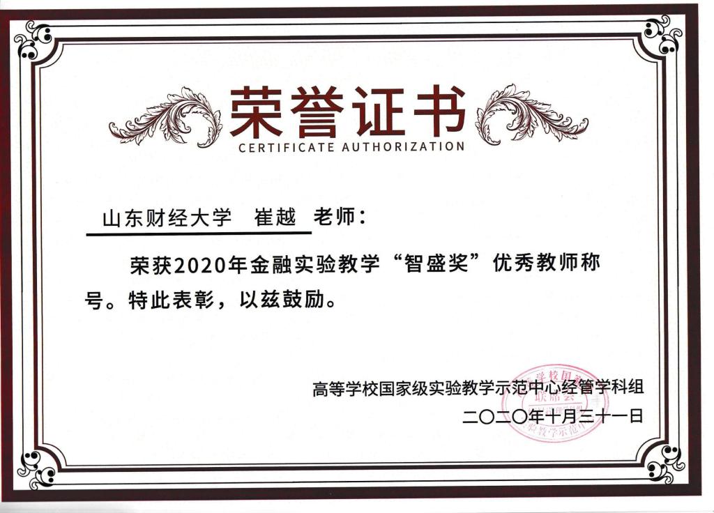 2020年10月31日-11月1日,由教育部高校国家级实验教学示范中心联席会经管学科组主办、浙江嘉兴学院承办的“第二十一届全国高校经管类专业实验室建设暨经济管理实验教学示范中心建设研讨会”在嘉兴举行。经学校推荐,学科组专家评选,海角app 崔越副教授荣获“智盛奖”优秀实验教师称号。