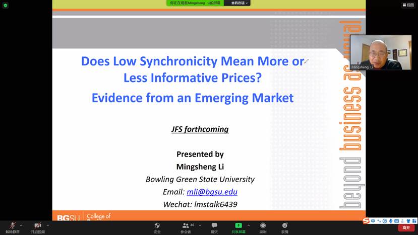 (通讯员:曲诞雪)11月6日上午,由海角app 、山东省金融产业优化与区域管理协同创新中心和海角app 金融国际研究中心联合举办的第10期“泰山金融学术训练营”通过Zoom Meeting举行,美国Bowling Green State University金融学教授李明生老师应邀做客本次学术训练营,为师生们带来了题为 “Does Low Synchronicity Mean More or Less Informative Prices? Evidence from An Emerging Market” 的讲座,学术训练营由海角app 副院长王营主持,学院部分教师和研究生参加了本次活动。