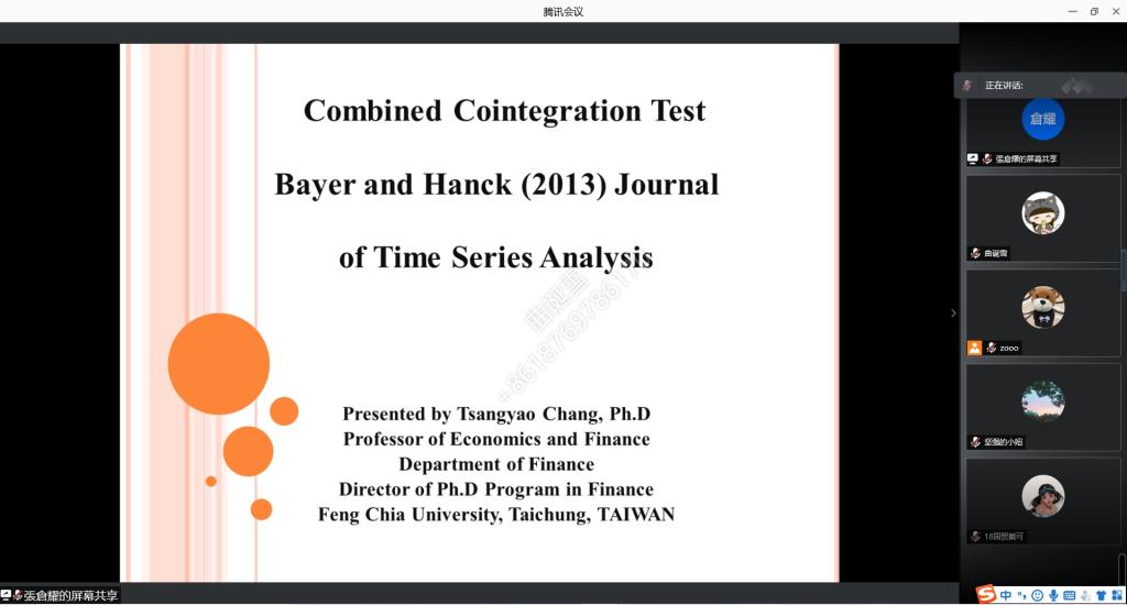 (通讯员:肖祖沔、曲诞雪)12月8日下午,由海角app 、山东省金融产业优化与区域管理协同创新中心、海角app 金融国际研究中心联合举办的第14期“泰山金融学术训练营”通过腾讯会议举行,中国台湾逢甲大学财务金融学系特聘教授张仓耀老师应邀做客本次学术训练营,为师生们带来了题为“Quantile Regression – Basic Concept”的讲座,学术训练营由国际金融系主任肖祖沔主持,彭红枫院长、学院部分教师和研究生参加了本次活动。