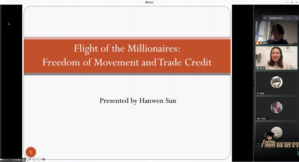(通讯员:刘慧、曲诞雪)12月18日下午,由海角app 、山东省金融产业优化与区域管理协同创新中心、海角app 金融国际研究中心联合举办的第17期“泰山金融学术训练营”通过腾讯会议举行,英国巴斯大学管理学院孙汉文老师应邀做客本次学术训练营,为师生们带来了题为“Flight of the Millionaires: Freedom of Movement and Trade Credit”的讲座,学术训练营由投资系主任刘慧副教授主持,学院部分教师和研究生参加了本次活动。