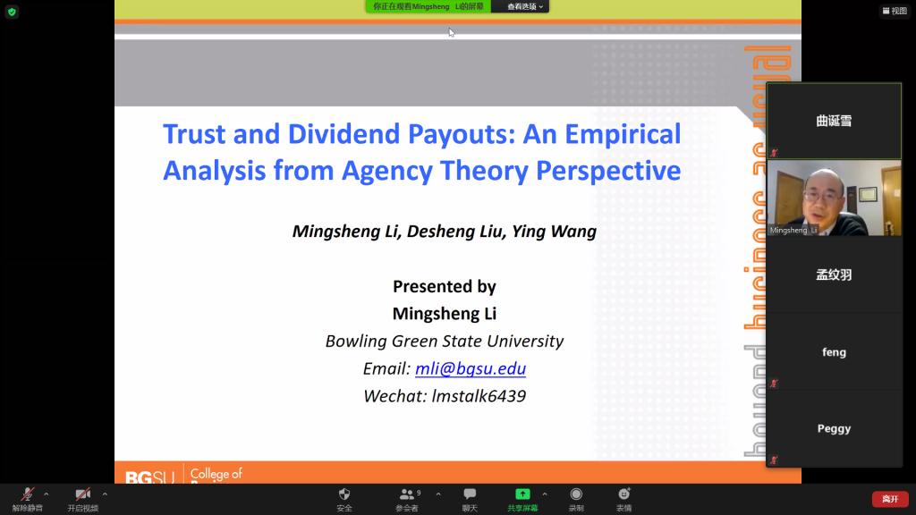 (通讯员:孟纹羽、曲诞雪)12月23日上午,由海角app 、山东省金融产业优化与区域管理协同创新中心和海角app 金融国际研究中心联合举办的第19期“泰山金融学术训练营”通过Zoom Meeting举行,美国Bowling Green State University金融学教授李明生老师应邀做客本次学术训练营,为师生们带来了题为 “Trust and Dividend Payouts: An Empirical Analysis from Agency Theory Perspective” 的讲座,学术训练营由海角app 金融科技系主任孟纹羽老师主持,学院部分教师和研究生参加了本次活动。