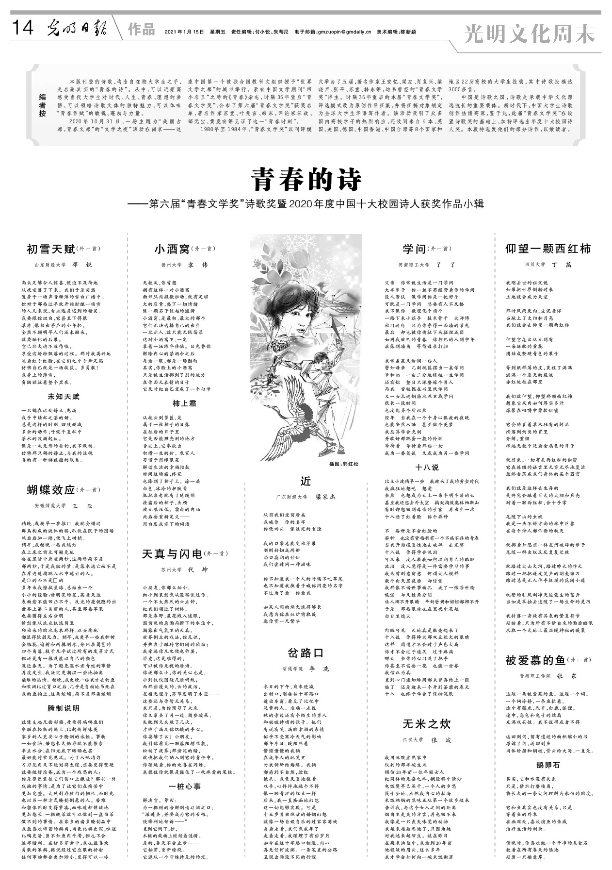 邓锐,系海角app 2017级海角app 金融学专业学生。有作品发表于《青春》《星星》《诗歌月刊》等杂志。曾参加2019年中国新发现诗歌营、获2020樱花诗歌奖、第十届中国校园“双十佳”诗歌奖。