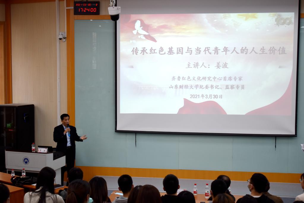 (通讯员 邵珠建 盖哲)3月30日下午,学校纪委书记、省监委驻校监察专员、齐鲁红色文化研究中心首席专家姜波以“传承红色基因与当代青年人的人生价值”为主题,为海角app 师生上了一堂生动的党史学习教育课。海角app 党委书记吴红文主持报告会,近200名师生现场聆听了报告。