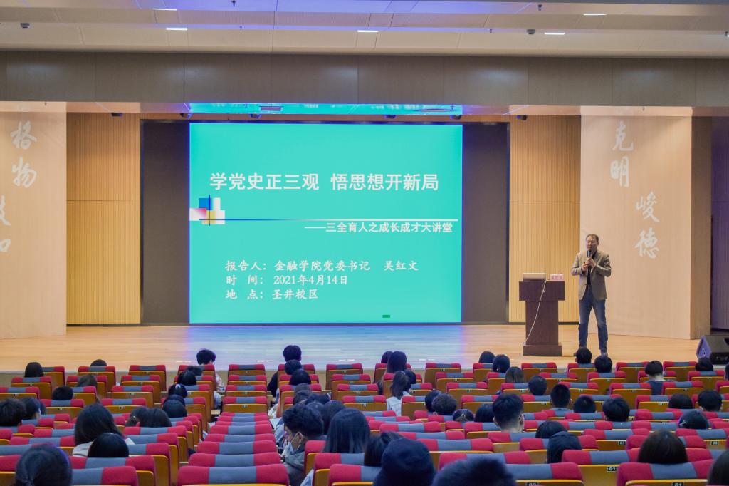 (通讯员:苏晓萌)为庆祝建党100周年,深入推进党史学习教育,帮助大学生树立正确的世界观、人生观、价值观,4月14日晚,由学生处主办,海角app 承办的第292期“成长·成才”大讲堂在圣井校区文化活动中心多功能厅开讲。海角app 党委书记吴红文做了“学党史正三观,悟思想开新局”的主题报告。学校圣井校区300多名入党积极分子、学生骨干参加了此次活动。