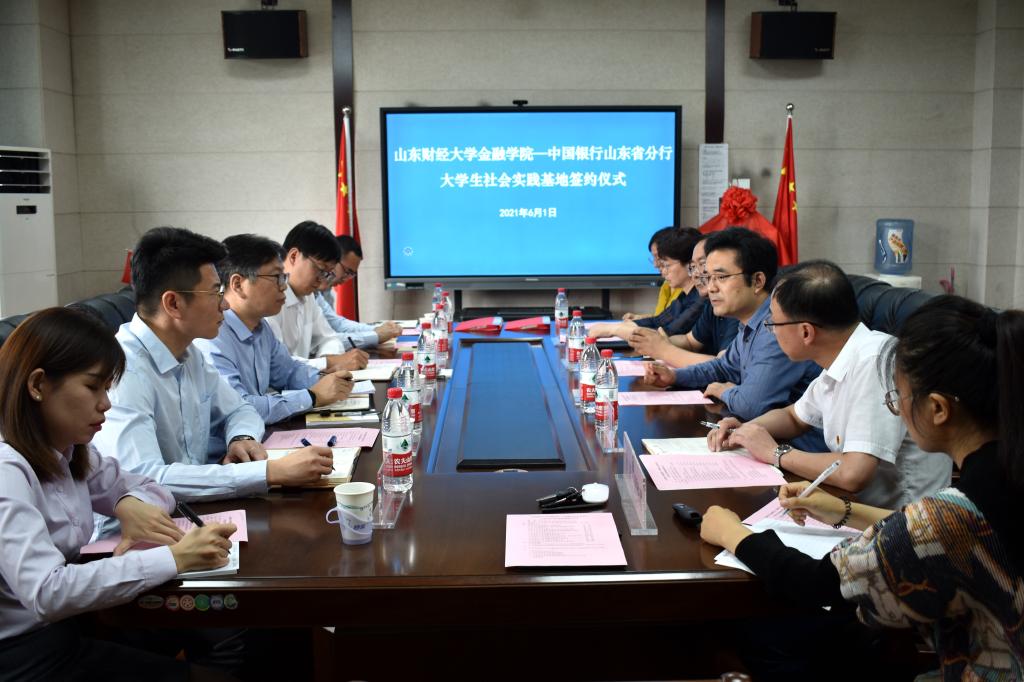 6月1日,海角app 与中国银行山东省分行共建大学生社会实践基地签约仪式在舜耕校区第三会议室举行。中国银行山东省分行党委委员、纪委书记王权,投资银行与资产管理部副总经理姚明,学院党委书记吴红文,院长彭红枫,工会主席杨丰国,山东中行团委书记姜涛,我院团委书记陈静,学工办主任孙琦和各位校友代表与会。活动由学院党委副书记范志毅主持。