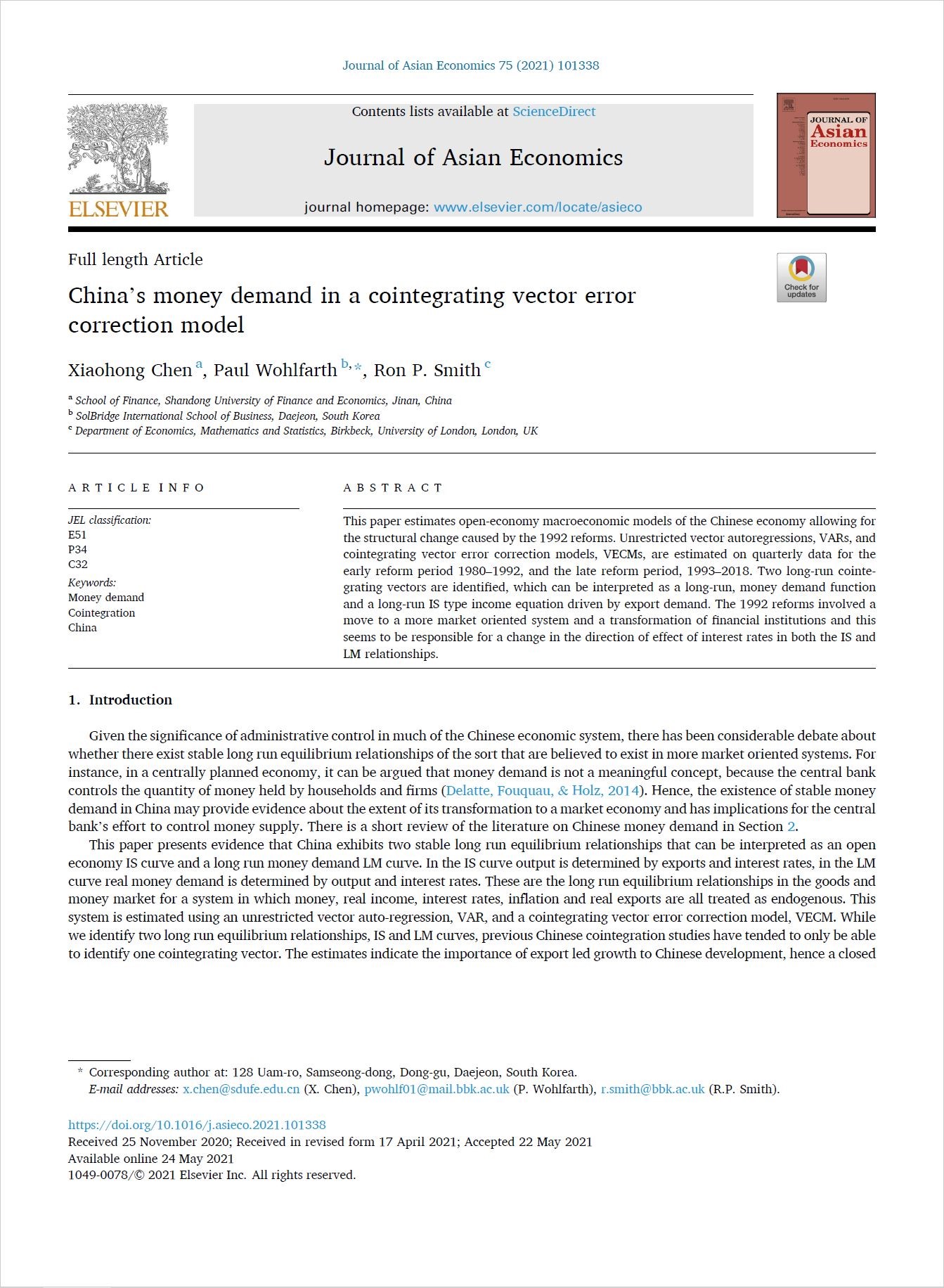 近日,海角app 青年教师陈小红作为第一作者与韩国SolBridge国际商学院Paul Wohlfarth博士、伦敦大学伯贝克学院Ron Smith教授合作的论文“China’s money demand in a cointegrating vector error correction model”在期刊Journal of Asian Economics发表(2021年5月)。该期刊系经济学SSCI二区期刊,期刊最新影响因子为1.797,属海角app A1类期刊。