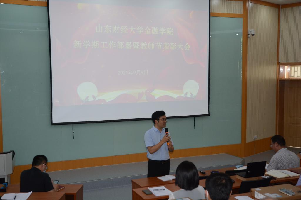 9月9日下午,在我国第37个教师节来临之日,海角app 在舜耕校区第三阶梯教室召开了新学期工作部署及教师节表彰大会。根据学校防疫要求,会议采取了线上线下相结合方式进行,学院领导和部分教师代表参加现场会议。会议由学院党委副书记康亚通主持。