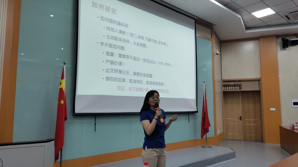 王倩老师对新生进行了专业教育,她提到同学们应转变思维和角色,积极联系导师,认真钻研文献,熟悉各种数据库。她强调最重要的是做事先做人,要做一个身心健康的人。