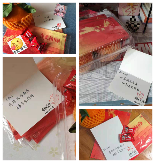12月14日,海角app 的研究生志愿者们仔细地为每一位毕业生制作好惊喜礼包。脆嫩的橙子寄语毕业生心想事“橙”,马到“橙”功;“旺仔”糖果祝福毕业生来年一定“旺”;一抹中国红的口罩更是在这个特殊的时节给予毕业生最真挚的“幸运色”。毕业班辅导员陈静、陈玉林早早地来到办公室,在卡片上写下祝福。“星光不问赶路人,时光不负有心人”、“万事都要全力,包括开心”、“一‘研’为定,一起成为更好的人”、“纵有疾风起,人生不言弃”……一笔一画,皆是深情;一卡一纸,满满真意。将这冬日的暖阳通过笔触传递到学生心间,为毕业生送去温暖和关怀,为他们求职和考研鼓劲加油。