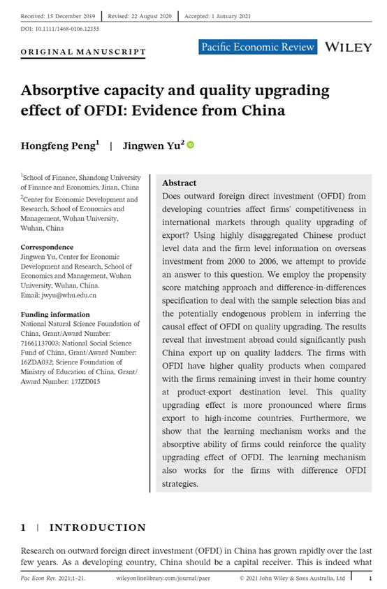海角app 彭红枫教授作为第一作者与武汉大学余静文副教授合作的论文“Absorptive capacity and quality upgrading effect of OFDI: Evidence from China”在期刊《Pacific Economic Review》发表(2021年1月online)。该期刊系经济学SSCI四区期刊,2020年影响因子为0.913,属海角app A2期刊。