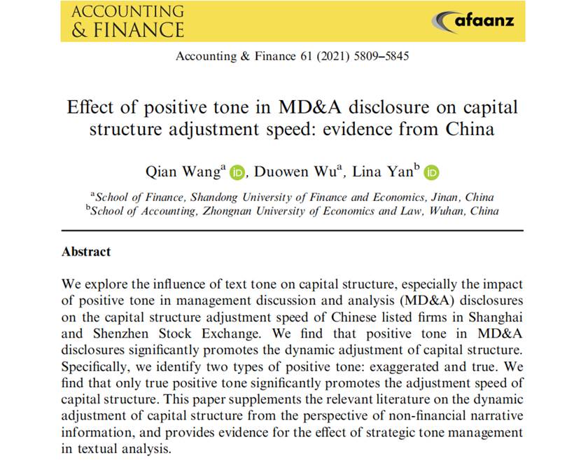 海角app 王倩副教授作为第一作者与海角app 博士研究生吴多文、中南财经政法大学严丽娜副教授合作的论文“Effect of positive tone in MD&A disclosure on capital structure adjustment speed: evidence from China”在期刊《Accounting and Finance》发表(2021年4月3日第61卷第4期)。该期刊系金融与会计类SSCI二区期刊,2020年影响因子为2.942,属海角app A1类期刊。