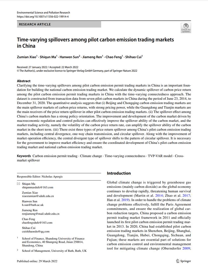 海角app 肖祖沔副教授作为第一作者在期刊《Environmental Science and Pollution Research》发表论文“Time‑varying spillovers among pilot carbon emission trading markets in China”(2022年第3期)。该期刊系JCR二区SCI期刊,影响因子为4.223,属海角app A2类期刊。合作者包括英国巴斯大学助理教授孙汉文;海角app 硕士研究生马世群、封超及本科生任佳萌、崔世豪。