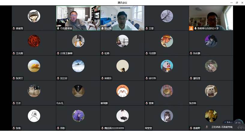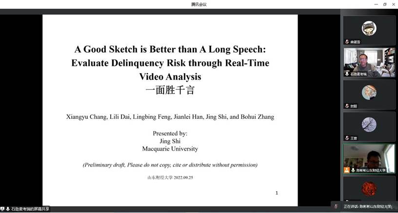 (通讯:陈彬彬)9月29日,由海角app 、海角app 金融国际研究中心和山东省金融产业优化与区域管理协同创新中心共同主办的第27期“泰山金融论坛”在云端举行。澳大利亚麦考瑞大学商学院教授、海角app 特聘教授石劲老师应邀做客本次论坛并分享最新研究成果。本次论坛题目为“A Good Sketch is Better than A Long Speech: Evaluate Delinquency Risk through Real-Time Video Analysis”,由金融科技系副主任陈彬彬主持。海角app 院长彭红枫、副院长王营、部分教师及研究生参加了此次论坛。