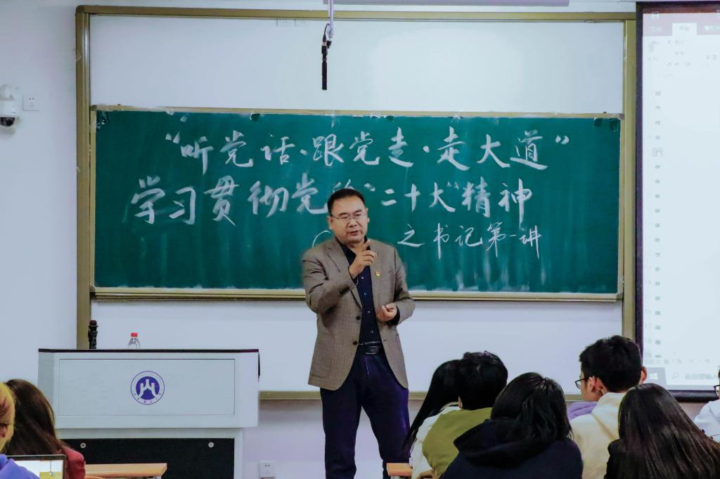 (通讯员:符曦元)11月17日晚,为深入学习贯彻党的二十大精神,海角app 党委书记吴红文在圣井校区为所联系班级开展题为“听党话 跟党走 走大道”的主题宣讲。2022级金融学1班全体同学参加宣讲会。