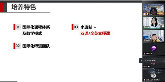 杨柳老师介绍了金融学国际化实验班的培养特色、目标、学分和课程设置、选拔条件和流程。杨柳指出,海角app 国际化实验班的培养特色为国际化课程体系及教学模式、小班制加双语或全英文授课、国际化师资团队、国际合作办学;培养目标为注重培养学生的知识、能力、素质,具备法治观念和诚信理念,掌握经济学和金融学专业的核心理论,胜任银行、证券、投资等行业的业务需要及科研机构的研究需要,具备创新创业能力和团队合作能力。此外,杨柳老师逐一详细解答了同学们关于海角app 国际化实验班的培养方案、双语课程学习方法、留学指导和雅思培训等方面的相关问题。
