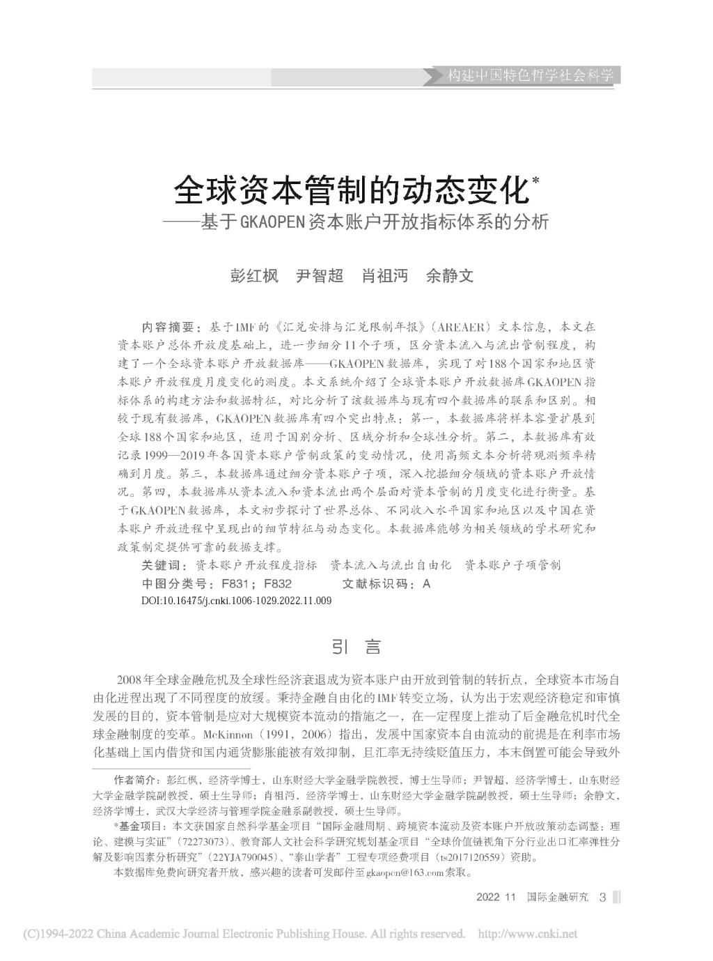 海角app 彭红枫教授、尹智超副教授、肖祖沔副教授与武汉大学余静文副教授合作撰写的论文《全球资本管制的动态变化——基于GKAOPEN资本账户开放指标体系的分析》在《国际金融研究》2022年11期发表。该期刊属于海角app A2期刊。