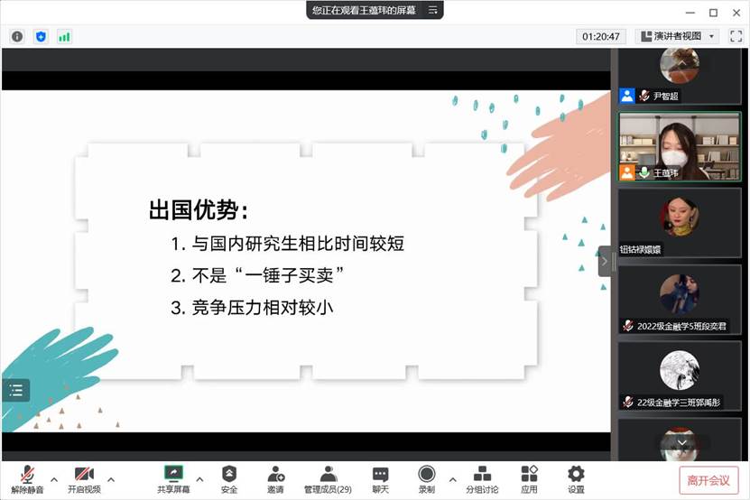 王蕴玮首先以详实的数据为同学们分析了当前国内考研和就业形势、出国留学优势;然后,分析了英国主要高校的基本情况,分享了在英国生活学习的课程形式、住宿、花费问题。最后,王蕴玮就申请英国高校可能遇到的问题、奖学金问题进行了分析,根据自身经验为有意向出国留学的同学提出“提升学习成绩”、“丰富学习经历”“提升语言水平”的要求,有助于同学们丰富个人简历和提高文书水平,做好留学的前期准备。