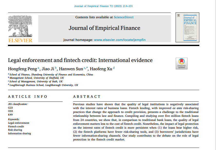 海角app 彭红枫教授作为第一作者与英国谢菲尔德大学Jiao Ji教授、英国巴斯大学的Hanwen Sun教授、英国拉夫堡大学Haofeng Xu教授合作的论文“Legal enforcement and fintech credit: International evidence”在期刊Journal of Empirical Finance正式发表(2023年3月)。该期刊为SSCI二区期刊,期刊最新影响因子为3.025,属海角app A1类期刊。