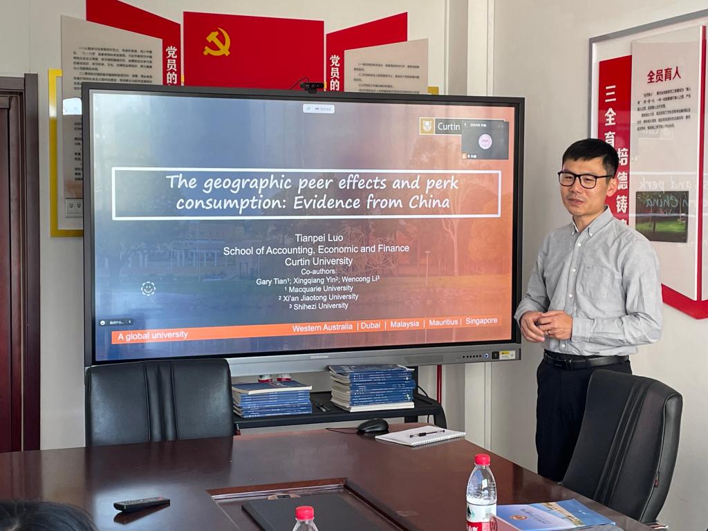 7月7日上午,澳大利亚科廷大学(Curtin University)经济与海角app 罗天培博士受邀访问海角app ,并作了题为“The geographic peer effects and perk consumption: Evidence from China”的学术报告。会议由海角app 副院长王营教授主持,海角app 部分教师和学生通过线上线下方式参加会议。