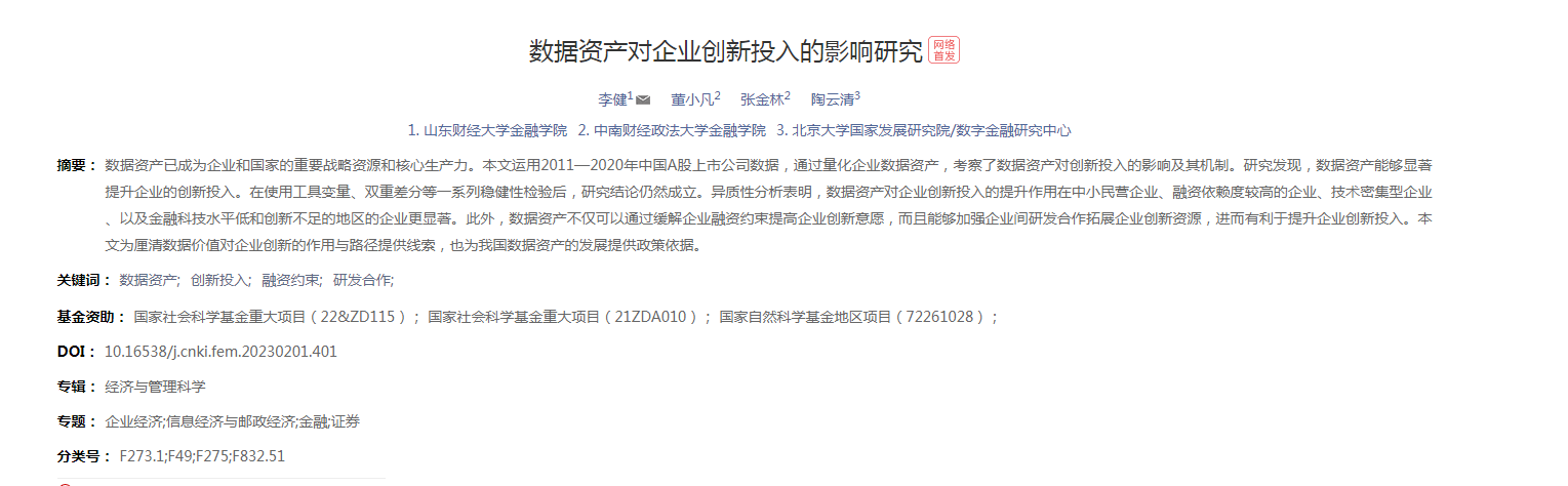 海角app 青年教师李健与中南财经政法大学董小凡博士、张金林教授、北京大学国家发展研究院陶云清博士合作撰写的论文《数据资产对企业创新投入的影响研究》在《外国经济与管理》2023年5期发表。该期刊属于海角app A2期刊。
