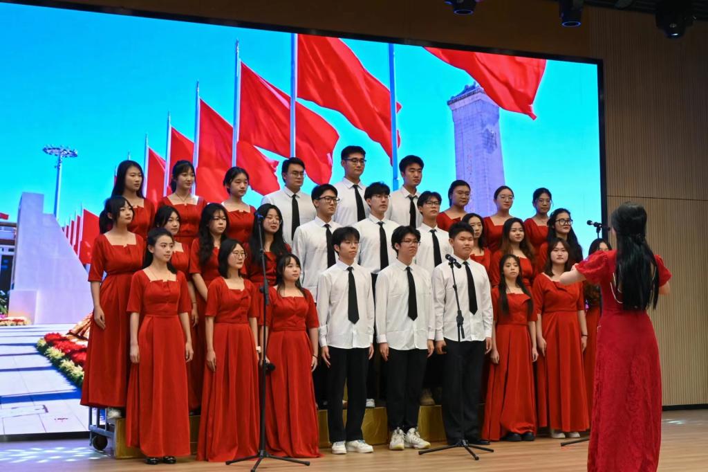 各班表演结束后,2023级导航学长学姐带来本次活动的惊喜节目——《重返十七岁》。青春活泼的歌舞演绎让在场观众们感受到了青春的活力,现场掌声雷动,欢呼不断。活动最后,全场师生齐声合唱了歌曲《红旗飘飘》。歌声铿锵有力又饱含深情,深情地表达了中华儿女对五星红旗的热爱,引发了全场观众对于祖国的依依眷念。